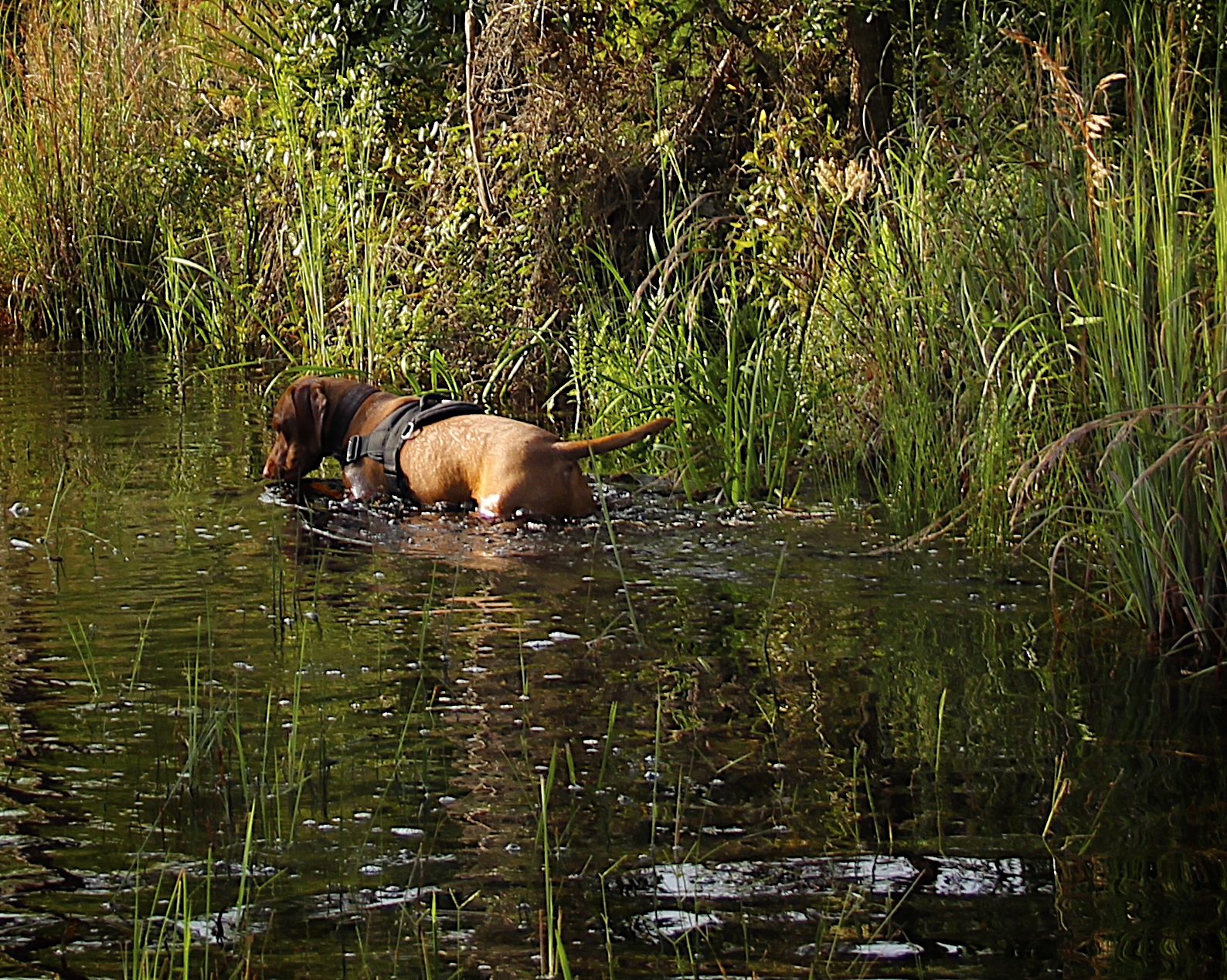 We endured over 15 minutes of deep water in the midst of sun around us, but rain upon us, literally! Winston, my shadow, my Vizsla, was having an amazing time. We finally came upon soggy, sandy ground on the outer rim of the park. I had to put my camera in the bag due to the rain. We continued hiking when we noticed all kinds of animal tracks. We saw fresh pig and coyote tracks…and something else. It definitely looked like a “cat” print, but the size was astounding. I pulled out my measuring tape and my neighbor’s son snapped a few pictures. The print measured over 3 1/2″ in length. I quickly pulled out my camera and snapped this photo…no doubt in my mind, it was a panther track.